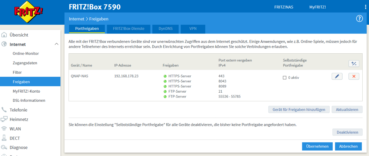 - Falls noch nicht geschehen "Gerät für Freigaben hinzufügen" wählen, oder auf den Stift neben dem entsprechenden Gerät klicken um Portfreigaben editieren zu können.
