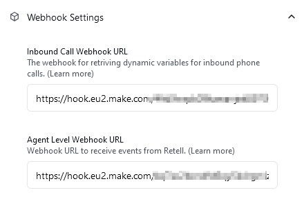 - gebe die Webhook URL (die vom Inbound Call Webhook) unter "inbound_dynamic_variables_webhook_url" ein