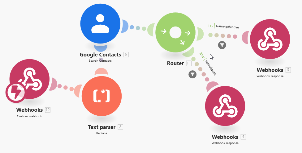 Jetzt geht es weiter bei Make.com. Hinter dem Custom Webhook fügst Du nun das Modul "Text parser - replace" sowie "Google contacts - search contacts" ein.