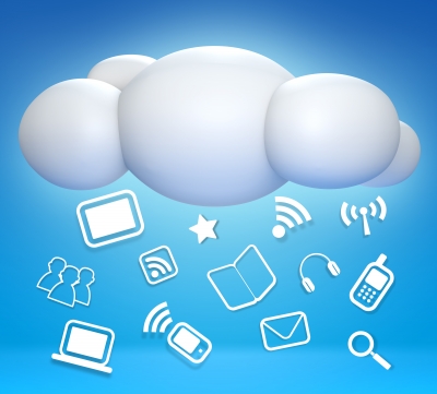 [A glowing cloud icon floating in the center of the image, surrounded by icons representing contacts, calendars, and files, all connected by thin blue lines symbolizing synchronization; background with a gradient from dark blue to light blue, modern and minimalistic, professional digital art style, soft lighting, high-resolution, 4k]