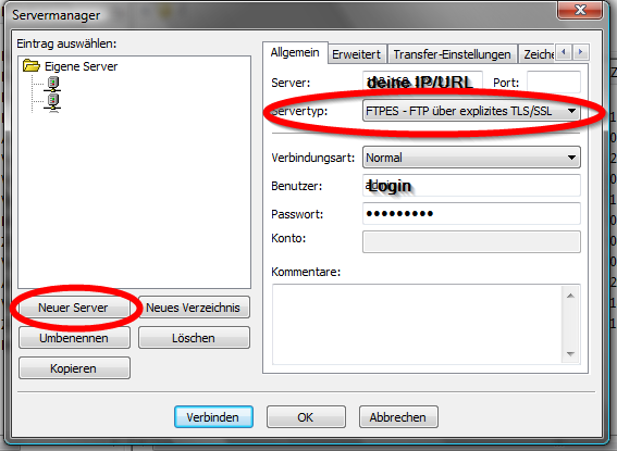 Innerhalb des Servermanagers klicken wir auf "Neuer Server" und geben unsere Daten auf der rechten Seite ein: Als Server die IP- Adresse unseres NAS, Port 21 (oder leer lassen), Als Servertyp wählen wir "FTPES - FTP über explizites TLS/SSL". Somit werden unsere Daten (auch das Passwort) verschlüsselt übertragen- wir wollen uns erst gar nichts Anderes angewöhnen! Der "Benutzer" ist derjenige, den wir vorab im NAS angelegt haben, ebenso sein Passwort. Jetzt noch ein Klick auf "Verbinden" und los gehts: