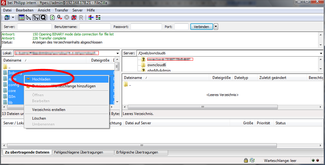 In diesem Fenster starten wir zunächst auf der rechten Seite: Unter "Server" suchen wir den Ordner in dem der Webserver die Daten der Webseiten sucht. Bei QNAP ist es das Verzeichnis "Qweb". Dort legen wir uns ein beliebiges neues Verzeichnis an, in unserem Beispiel "onwcloud6". Wir öffnen dieses Verzeichnis, dies ist das Ziel für unsere Daten. Auf der linken, lokalen Seite gehen wir nun zu dem Verzeichnis, in das wir unsere Nextcloud Installation entpackt haben, markieren alles, klicken mit der rechten Maustaste darauf und bestätigen mit "Hochladen". Filezilla kopiert nun alle Nextcloud Dateien in den links ausgewählten Bereich auf dem Server.