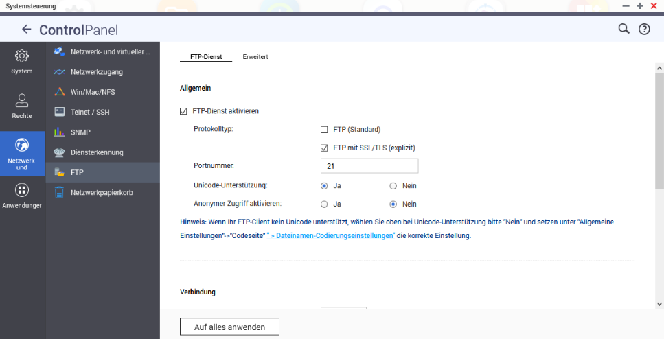 Aktivierung des FTP Servers auf einem QNAP NAS: