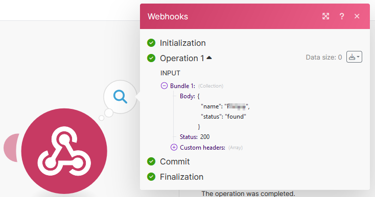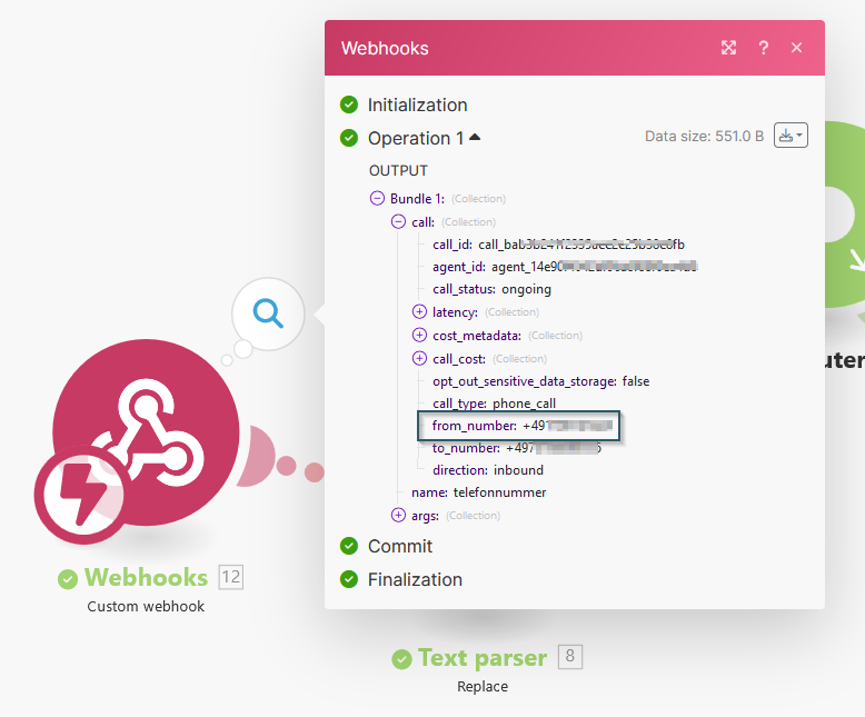 Wir starten wieder mit einem "Custom Webhook"- Modul (wie hier beschrieben). Diese Webhook- URL tragen wir bei Retell AI nun aber im Feld "Inbound Call Webhook URL" ein.