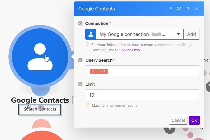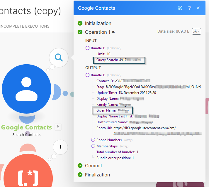 Als nächstes Verbinden wir das "Google Contacs - search contacts-" Modul. Hier musst Du Dich vorher mit Deinem Google- Account anmelden. Selbstverständlich sich hier auch alle anderen, denkbaren Module (bspw. Google Calendar) zum Abgleich möglich. Die modifizierte Nummer übergeben wir zur Suche (linkes Bild) und erhalten im positiven Fall die Antwort wie auf dem rechten Bild:
