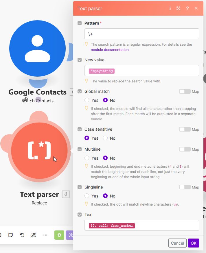 Jetzt geht es weiter bei Make.com. Hinter dem Custom Webhook fügst Du nun das Modul "Text parser - replace" sowie "Google contacts - search contacts" ein.