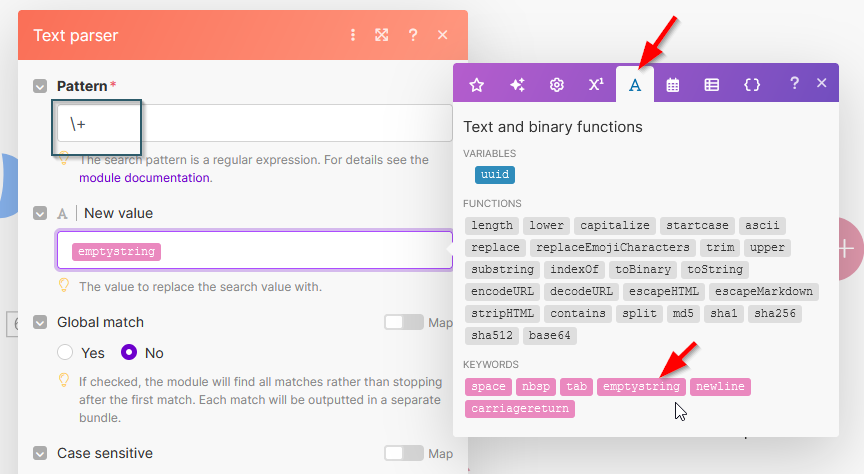 Google kann in der Suche das "+" nicht verarbeiten, dieses muss weg. Das erledigt das Modul "Text parser - replace", aber was genau muss man da eingeben?! Damit das "+" nicht als Operator erkannt wird, müssen wir ein "\+" einfügen und dieses Zeichen soll dann durch "Nichts" ersetzt werden. Man kann aber nicht einfach "nichts" oder "null" verwenden, sondern wir benötigen die "emptystring"- Variable. Am besten erkläre ich dir Schritte an den folgenden Screenshots: