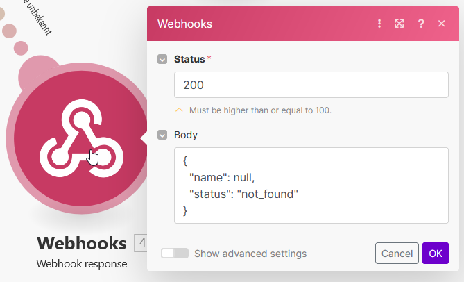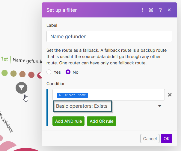 Jetzt benötigen wir zwei Routen: Eine für den Erfolgsfall und eine, falls der Kontakt nicht gefunden wird. Nach dem Router- Modul setzten wir zwei Webhook- Response- Module, die Verbindungen erhalten jeweils einen Filter. Für den positiven Fall, der Kontakt wird gefunden und der Vorname soll übergeben werden, schaut der Filter so aus:
