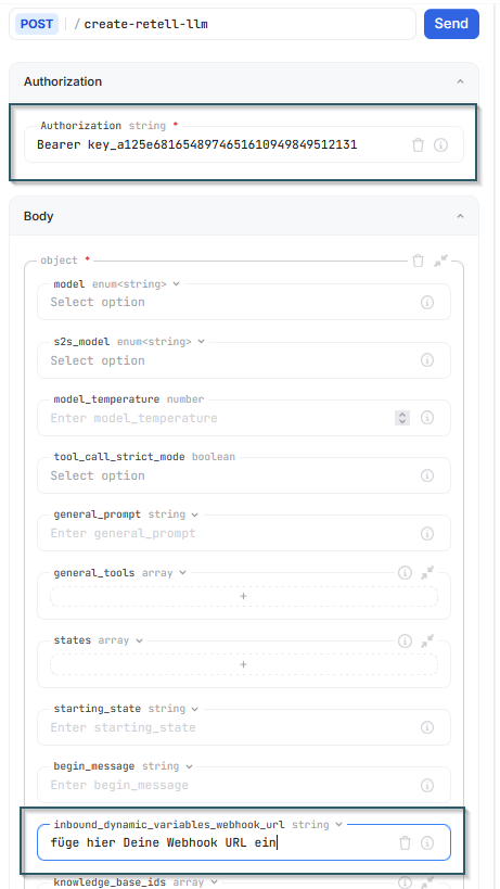 - gebe die Webhook URL (die vom Inbound Call Webhook) unter "inbound_dynamic_variables_webhook_url" ein
